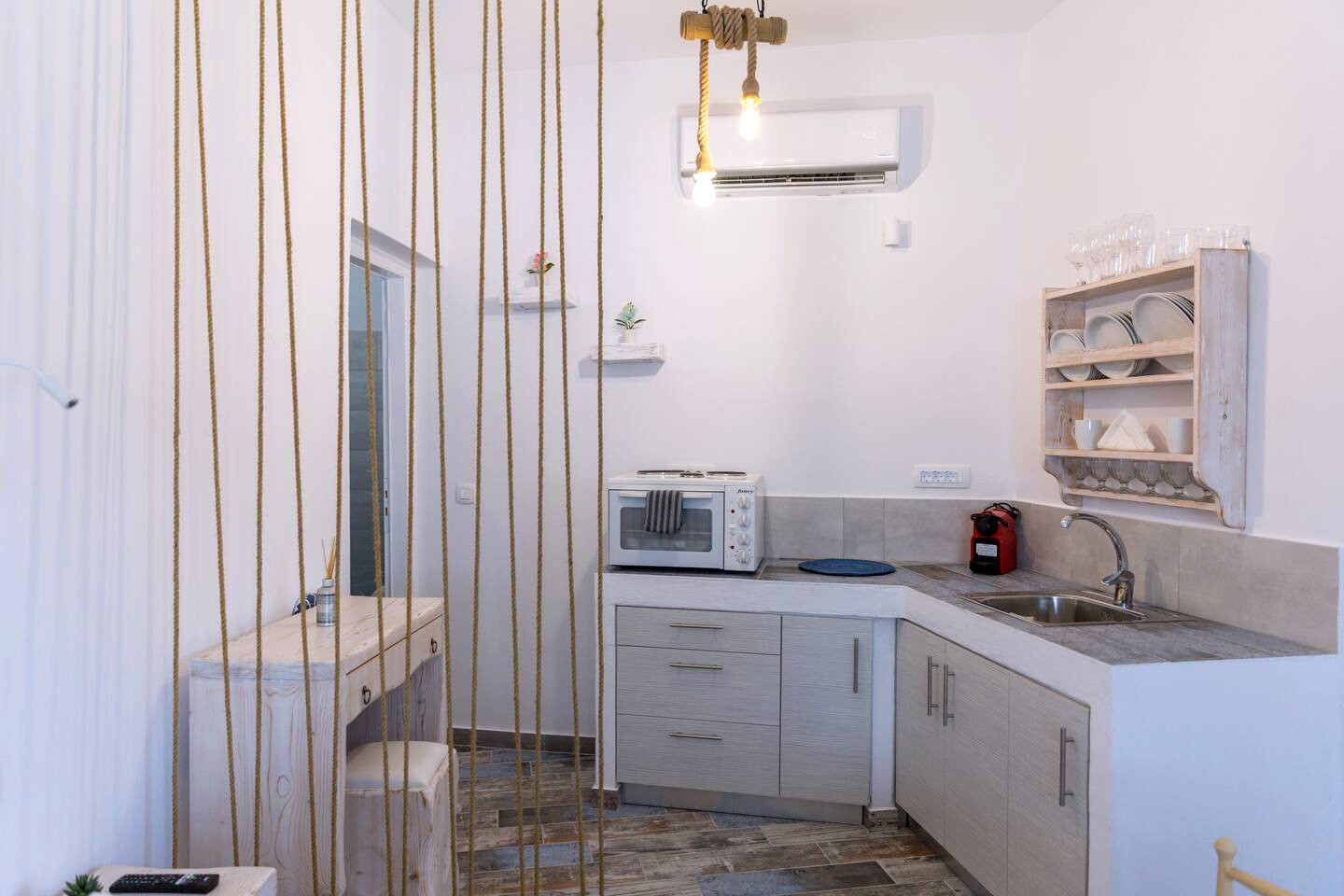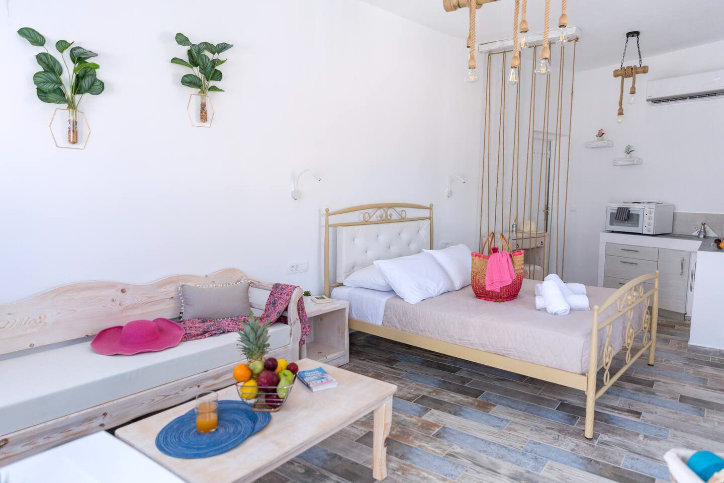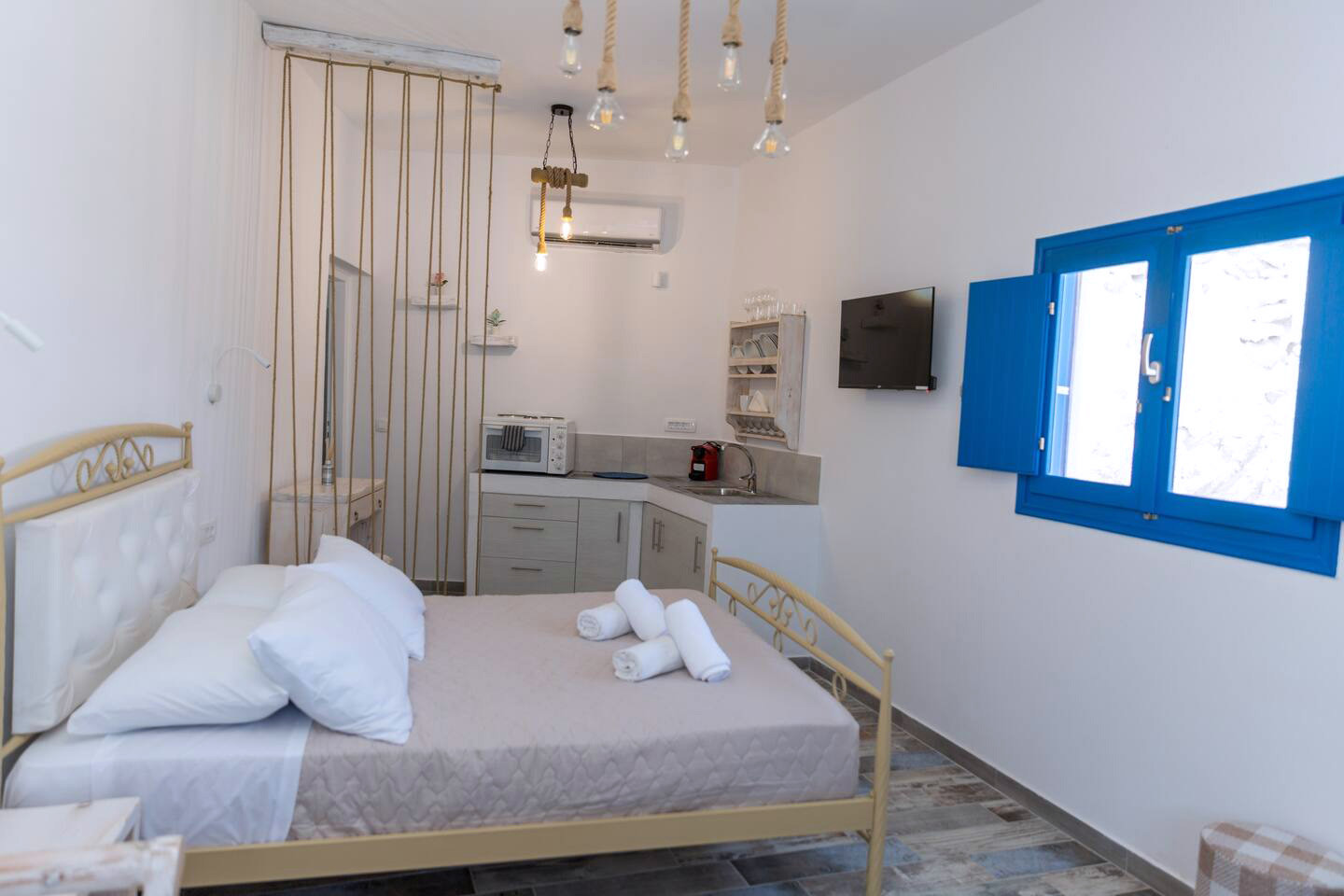 With a stunning view to the emerald waters of the sea, the superior suite is the best option to revive your spirit. The traditional design of the suite gives it a distinctive touch that creates a soothing ambiance for the guests. The comfortable double bed and the cozy sitting area will provide the perfect place to rest after a long expedition on the island while the lovely kitchenette will offer you the luxury of preparing a quick meal on your own.